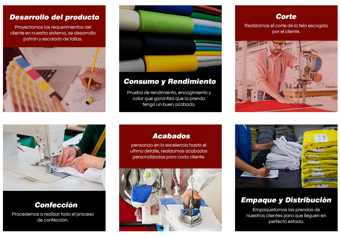 Los productos son confeccionados cumpliendo las especificaciones técnicas y requisitos establecidos por nuestros clientes bajo altos estándares de calidad, brindando a nuestros clientes una excelente atención, entregas oportunas y prendas de calidad, para ello contamos con personal capacitado y especializado en cada una de las aéreas de la empresa, así mismo contamos con maquinaria adecuada, tecnología sofisticada y automatizada que nos permite tener una mayor eficiencia y eficacia en todo el proceso de confección,